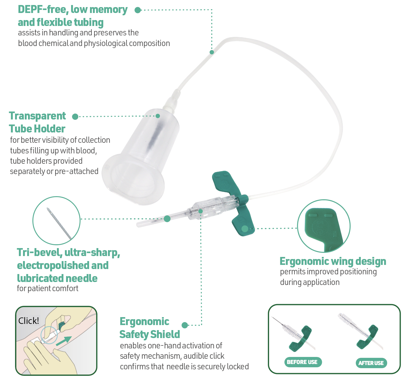 Available in different needle configurations and with/without pre-attached tube holders: